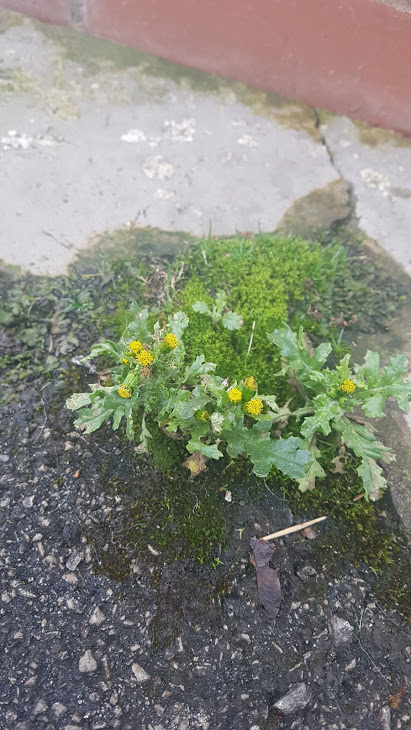 What is it? A small insignificant looking member of the daisy family. It looks a bit like a small dandelion or ragwort that ca’t really be bothered to flower properly. The petals seem to barely poke through creating a thick paint-brush effect. They appear to like growing out of the base of walls and in cracks in the pavement. A pioneer plant definitely (ie: one that colonises an area first). Their seeds are a lot like dandelions, white fluffy things that are transported on the breeze – and presumably end up in pavement cracks.