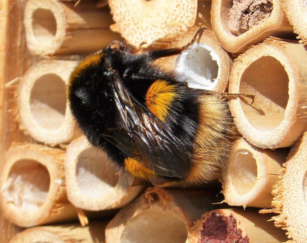 What is it? A large furry member of the bee family, and more specifically a member of the genus Bombus a.k.a the bumblebees. The buff-tailed is a very common bumblebee in the UK but can be hard to identify. At this time of the year they are relatively easy as there are mostly only queens around, and it is they who have the off-white buffy tails. However, the workers and males (who appear later and will be more numerous) have less buff-coloured which look almost white; which makes them almost identical to another species – the White-tailed Bumblebee B. lucorum agg. (the agg. stands for aggregate as this ‘species’ is actually 3 species). I am confident of mine being a buff as I could clearly see the colouring, and as I say the time of year; queens appear first having overwintered as adults, they then find a burrow to lay pre-fertilised eggs from the previous autumn which pass through the larval stage to emerge as worker bees later in the spring. Buff-tails make their nests underground.
